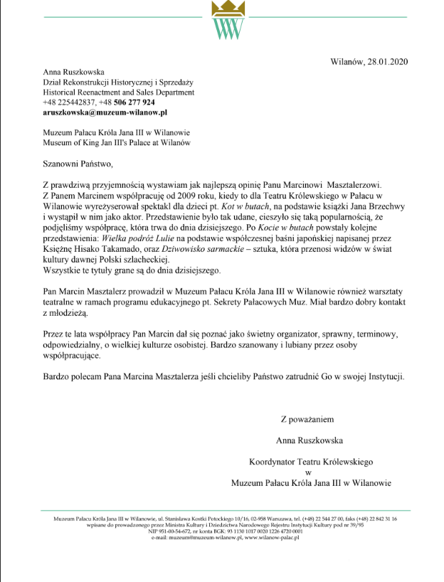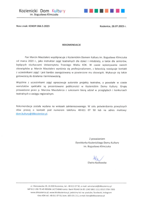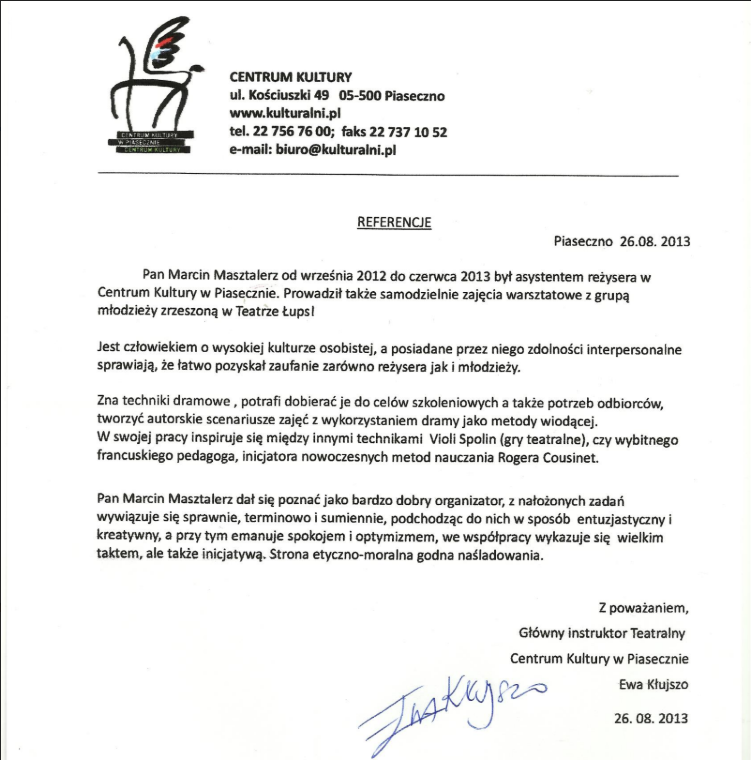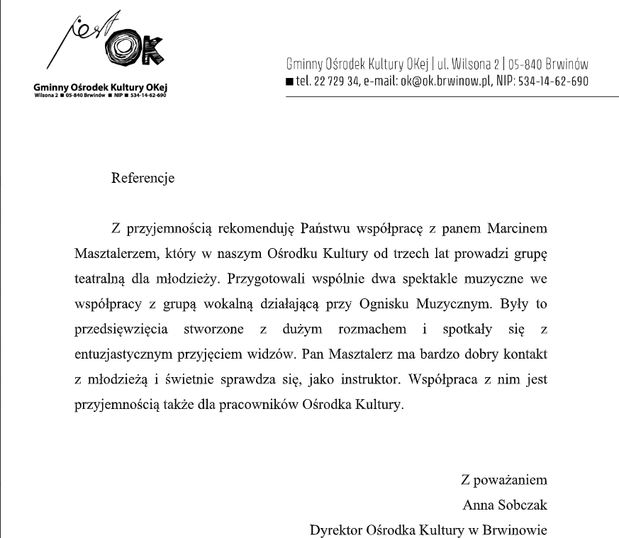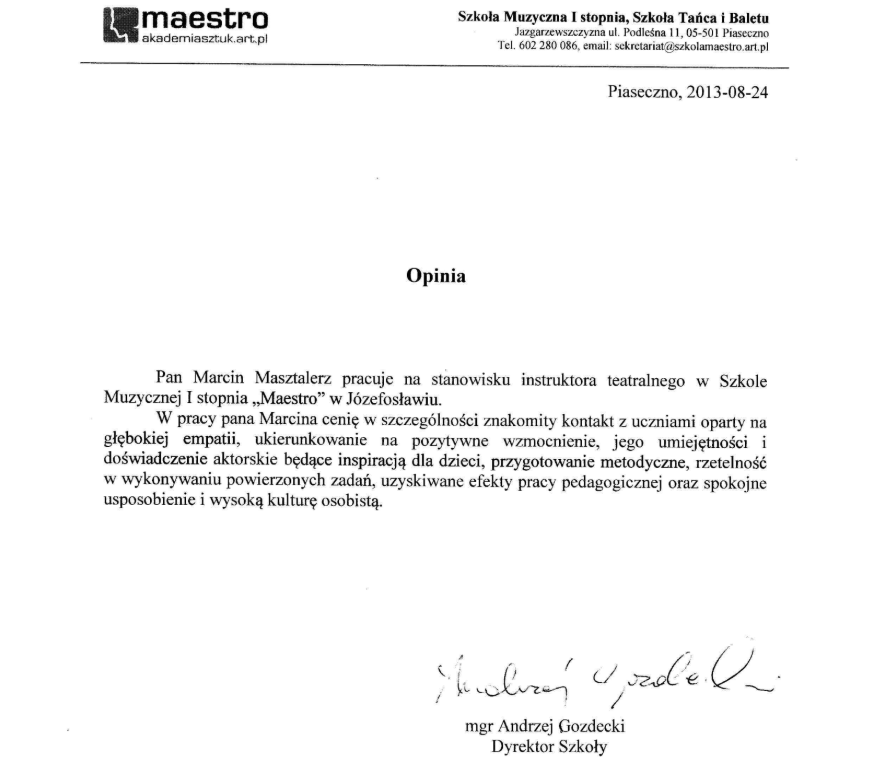 Oceniam aktorskie, reżyserskie i pedagogiczne kompetencje Pana Marcina bardzo wysoko, wypełnia on powierzone mu zadania w stopniu wzorowym z pełnym zaangażowaniem i profesjonalizmem zyskując przy tym szacunek sympatie i życzliwość uczniów oraz rodziców.